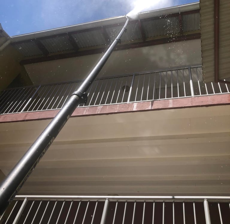Effective pressure cleaning for all externals of buildings, roofs, driveways, walkways and patios. Equipment to reach those high places.
